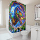 Esta cortina de chá tem um design de dinossauro nela.