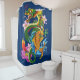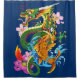 Um dragão chinês verde com um peixe koi laranja com flores de lótus e flores de cereja contra um pano de fundo de azul escuro.