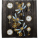 Marcadores e teclas antigas com engrenagens de ouro e latão, decoradas com libélulas mecânicas e boias em fundo castanho e listrado.