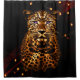 Eclipse Majestade, mostre um leopardo com pele de ouro brilhante e manchas distintas, colocado sobre um fundo escuro. Os olhos do leopardo estão iluminados em roxo brilhante, criando um efeito marcante e místico. Os arredores escuros são acentuados por luzes espalhadas e quentes, dando à cena uma atmosfera dramática quase de outro mundo.
