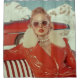 Uma imagem impressionante de uma na moda que abraça a elegância retrorreflectora numa jaqueta vermelha brilhante com um colar de pele branco. Ela é acessada com óculos de sol cristal, pérolas e joias intricadas, exuberando luxo contra um pano de fundo de montanhas nevadas e um conversível vermelho clássico.