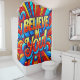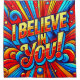 Esta cortina de chá colorida diz "Eu acredito em você!" nela.
