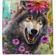 O vermelho feroz do pelo do lobo se destaca em flagrante contraste com a delicada beleza das pétalas giratórias de flores brancas, amarelas e cor-de-rosa que enfeitam sua figura.
