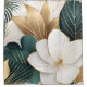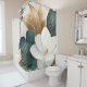 Grandes flores brancas com sotaques dourados combinam-se com folhagem verde e dourada para criar um belo e elegante design nesta cortina de chá.