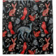 Illustrated black background features patterned red and blue birds, a rabbit, and a deer among white floral designs, creating a whimsical, folk-art style.