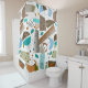 Cortina de chá moderna do meio século, formas abstratas lunáticas, triângulos múltiplos, Bumerangues, linhas de cruzamento, pontos e círculos nas cores de marrom, de azul, a laranja e o verde. Cortina de chá perfeita para algum banheiro moderno do meio século.