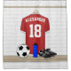 Uma nova versão do design de futebol único de Jérsia Gifts Bonanza apresenta uma camisa de futebol vermelha e branca pendurada num armário com uma bola de futebol, uma garrafa de água e um chute de futebol no banco. A camisola de futebol tem texto personalizável para o nome do jogador de futebol, treinador de futebol ou fã de futebol e número ou idade.