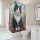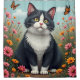 Um gato preto e branco com olhos brilhantes se senta entre flores coloridas, observando duas borboletas voando nas proximidades. A cena é vibrante e serena, com um belo pano de fundo azul.