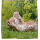 Um gatinho engraçado e frisky, uma tábua vermelha e um gatinho branco com olhos azuis maravilhosos, no brincar e mostrar suas garras lá fora na grama verde, faz você sorrir. Foto de gatinho tirada por Katho Menden. Esta cortina de chá é uma ideia de presente para amantes de gatos.