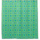 Cortina de chá em padrão geométrico em tons de verde limão, azul e turquesa, acentuados com azul profundo