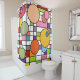 Esta cortina de chá tem um design moderno do século médio de uma grelha com alguns retângulos coloridos e círculos no topo em cores retrorreflectoras.