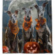 Libere o espírito assustador com esta design sombria do Dia das Bruxas apresentando um bando de cachorros sob um céu escuro e iluminado, cercado por morcegos voadores e abóboras brilhantes. Perfeito para aqueles que amam um toque de diversão terrível com seus amigos peludos!