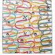 Esta cortina de chá tem um design moderno do século médio de rabiscos correndo verticalmente em cores retrógradas com estrelas pretas e círculos espalhados sobre a design.