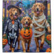 Adoráveis Retrievers de Ouro vestidos com fantasias lúcidas de Halloween baldes de abóbora carregar enquanto se trata ou se engana sob o céu iluminado. Este design festivo destaca o casaco ouro, os olhos amáveis e a personalidade amorosa da raça, capturando perfeitamente a atmosfera assustadora e divertida da noite de Halloween. Uma celebração alegre para amantes de cães e fãs de Halloween.