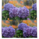 Esta cortina de chá apresenta uma representação impressionista de lindas drangas roxas crescendo por uma cabana ao largo de Connecticut.