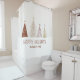 A cortina de chá festiva elegante do banheiro apresenta uma mostra elegante de árvores de Natal nevadas em vermelho, dourado e rosa em um fundo bege borrado levemente listrado com neve. A seção inferior é coberta de neve branca com "Felizes Feriados" em tipografia clássica elegante. Adicione um nome personalizado ou uma linha de texto personalizado em um script vermelho correspondente ao modelo simples de usar.