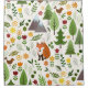 ilustrações da natureza do estilo de arte popular escandinavo (floresta; raposa, folhas, árvores, flores, montanhas e aves) num padrão de superfície design sobre fundo de natas claras.