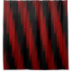 Este trabalho de arte de cortina de chá incorpora formas diagonais em uma variedade de tons vermelhos claros e escuros, assim como uma cobertura vertical de faixa preta em uma rica canvas preta.