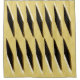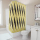 Este trabalho de arte de cortina de chá apresenta formas geométricas tridimensionais em preto, branco e ouro-marrom, com faixas diagonais sobre fundo amarelo de girassol.