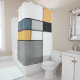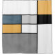 Arte abstrato moderna com retângulos coloridos (azul marinho, cinza, preto, amarelo, branco) no estilo Mondrian sobre fundo branco