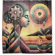 Trabalho de arte abstrato gráfico colorido de uma mulher enfeitiçada em flores, sol e estrelas, com efeito de aquarela e texturas.