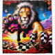 Esta cortina de chá tem um leão pintado nela.