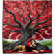 Esta legal cortina de chá tem uma enorme árvore vermelha e um leão com um homem vermelho pintado nela.