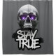 Adicione um estilo ousado ao seu banheiro com esta Cortina de Chá Crânio "Permaneça Verdadeiro". Apresentando um crânio detalhado com olhos roxos brilhantes, sotaques costura e letras no estilo do grafite, este design faz uma declaração sem medo. Perfeito para fãs de estilo gótico, arte de rua, ou qualquer um que queira dar a seu espaço uma única margem de alternativo. Feito com tecido durável e impressão vívida para função e estilo impressionante.