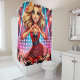 Esta cortina de chá tem uma mulher com mãos de coração nela.