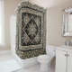 Esta Cortina de Chá Boho tem medalhões em tons de sépia em Preto. Os tons de preto, creme e bronzeado dominam. O design lembra um tapete persa. As imagens do Medallion vêm de um azulejo feito à mão pelo azulejo de Oregon Fay Jones Day.