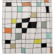 Este padrão único de idade atômica inspirado retroativamente tem linhas de flexão para formar uma grade torta, com vários quadrados coloridos.