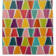 Este impressão geométrico tem formas trapezoides simples em tons brilhantes de verde limão, azul turquesa, roxo, lacre, vermelho, laranja, amarelo e rosa contra fundo creme colorido para um aspecto mosaico ou colorido. Esta cortina de chá coordena com outros itens na Coleção de Primaveras de Palma da Delfuneum.