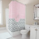 Cinzas monogramas e padrão de fevron branco com uma cortina de chá rosa e branca pastel. O design apresenta uma cinza e um padrão de fêmur branco na metade inferior e na metade superior um padrão de bolinhas rosa e branco pastel. O design é atravessado por uma banda rosa pastel e no meio há um rosa pastel com sua inicial personalizada.