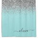 Cortina de chuveiro de banheiro com monograma de metal polido com brilho falso azul aqua - verde-água e prata. Isso torna o presente perfeito para o aniversário de 16 anos, casamento, chá de noiva, aniversário, chá de bebê ou festa de despedida de solteira para alguém que ama luxo glamoroso e estilos chiques.