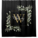 Cortina de chuveiro com nome monograma floral de folhas verde água elegante com um monograma inicial dourado em um fundo preto com o seu nome definido em uma fonte branca elegante. Concebido por Thisisnotme©