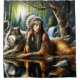 Num tranquilo cenário florestal, uma mulher indiana nativa adornada em trajes tradicionais vibrantes repousa pacificamente ao lado de um lobo majestoso. Cercado por água esmagadora e verde em cascata, a ligação entre os dois reflete harmonia e conexão com a natureza.