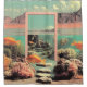 Uma porta fica em uma paisagem desértica, levando a uma cena submarina. Contraste colorido de peixes e corais com as montanhas áridas no fundo.