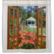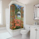 Uma série de cortinas de chá com uma cena da paisagem exterior vista através da multi-paned janela com cortinas. Dê a seu banheiro o olhar pairoso de uma janela de imagem com cenário bonito.