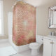 Uma legal cortina de chá de tons cor-de-rosa com um padrão divertido de vidro colorido/mosaico! Vai excelente num banheiro branco!