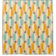 Padrão retrô simétrico com formas azul-turquesa, amarelas e laranja entrelaçadas em um fundo bege. Acentos pretos em forma de estrela adicionam contraste, criando uma sensação vintage.