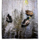 Grupo de três patos-reais masculinos e femininos numa água fria de uma lagoa no final do outono. A mistura de galhos salgados com algumas folhas amarelas verdes e linhas finas de algumas plantas de água pintam em cena. Humor de outono. Cortina de chá para decorar seu banheiro por diversão e bom humor.