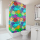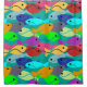 Esta cortina de chá tem um design de uma escola de peixes nadando no oceano em verde, azul, laranja, amarelo, vermelho, rosa e azul-esverdeado.