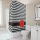 Faça uma declaração de moda no seu banho com esta sofisticada cortina de chá chevron branco e preto, com o seu monograma inicial. Você pode facilmente personalizar a inicial, que se senta em um ponto grande de círculo vermelho ou mudá-la para uma palavra ou nome. O ponto vermelho se senta em uma faixa preta com bordas vermelhas. A design gráfica Chevron zig zag é uma das tendências mais quentes de arte e design, e é extremamente popular de moda a decoração doméstica. Coordenar com um tapete de banho ou escova de dentes e caixas de loção ou sabão nesta loja. Excelente para um banho masculino ou feminino de na moda e tendência.