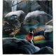 Dois patos de madeira em uma lagoa em uma floresta, árvores e rochas ao redor da lagoa enquanto os patos de madeira masculinos e femininos curtem a lagoa