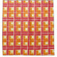 Esta cortina de chá tem um design geométrico de L's em vermelho, laranja e amarelo, colocado em diferentes direções num campo de branco.