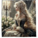 A woman in an opulent, baroque-style gown adorned with intricate lace and pearls sits gracefully on a luxurious throne. Her long, wavy hair cascades down her back, complemented by elaborate jewelry including earrings and a necklace. The setting is richly decorated with white tulips, a chandelier, and ornate drapery, evoking a sense of grandeur and historical elegance.