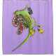 Uma lagartixa verde com marcas vermelhas está em um design tribal preto, vermelho e branco em pano de fundo roxo