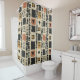 Earthy geometric pattern shower curtain inspired by tribal mudcloth textiles, featuring hand-painted rectangles, diamonds, and triangles in charcoal black and terracotta on a textured beige background. A warm boho design ideal for rustic décor lovers, artisan style fans, and anyone drawn to earthy geometric aesthetics.