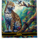 Uma cortina de Chá surpreendente apresenta um leopardo majestoso que está soltando um galho vibrante e tortuoso, cercado por aves tropicais coloridas e folhagem exuberante, incorporando uma atmosfera de selva viva. NOTA Para Alterar Cores de Texto ou Borda Use A Ferramenta Editar Usando Design