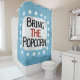"Traga a pipoca" é um design de texto fofo em azul claro com texto preto e vermelho, junto com uma forma de sotaque branca e pontos brancos texturizados ao seu redor.